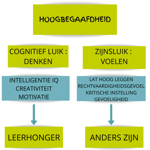 Het IQ is dus maar een klein onderdeel van het Hoogbegaafd zijn. Tessa Kieboom heeft een mooi zijnsluik gemaakt en hierbij kun je al zien dat er 2 takken zijn. Het deel “voelen” en het deel “denken”.